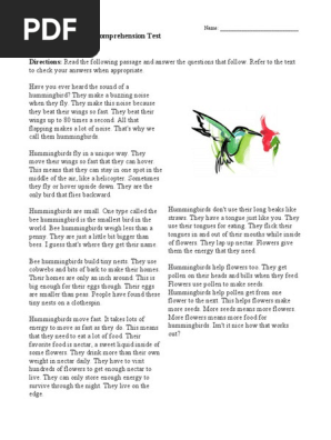 Nonfiction Reading Comprehension Test Hummingbirds Reading Comprehension Test Hummingbirds Directions Read The Following Passage And Answer The Questions That Follow Refer To The Pdf Document